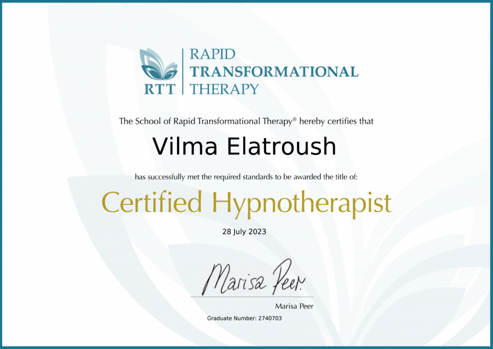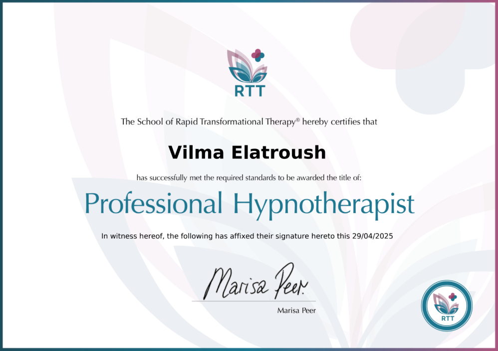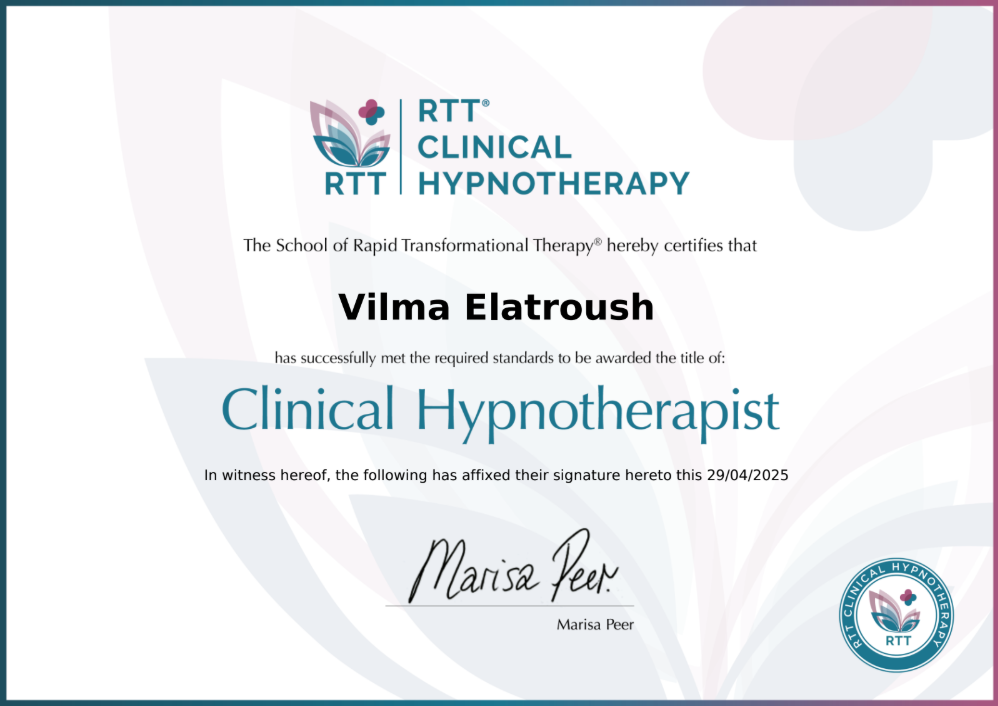 2023 metais baigiau RTT hipnoterapijos mokslus, o 2025 metais baigiau RTT klinikinės hipnoterapijos kursą, kuris buvo parengtas pagal Tarptautinės Hipnoterapijos asociacijos reikalavimus. Esu viena iš 60-ies specialisčių visame pasaulyje, kuriems buvo suteikta Profesionalaus Hipnoterapeuto (Professional Hypnotherapist) kvalifikacija baigus akredituotą klinikinės hipnoterapijos programą.