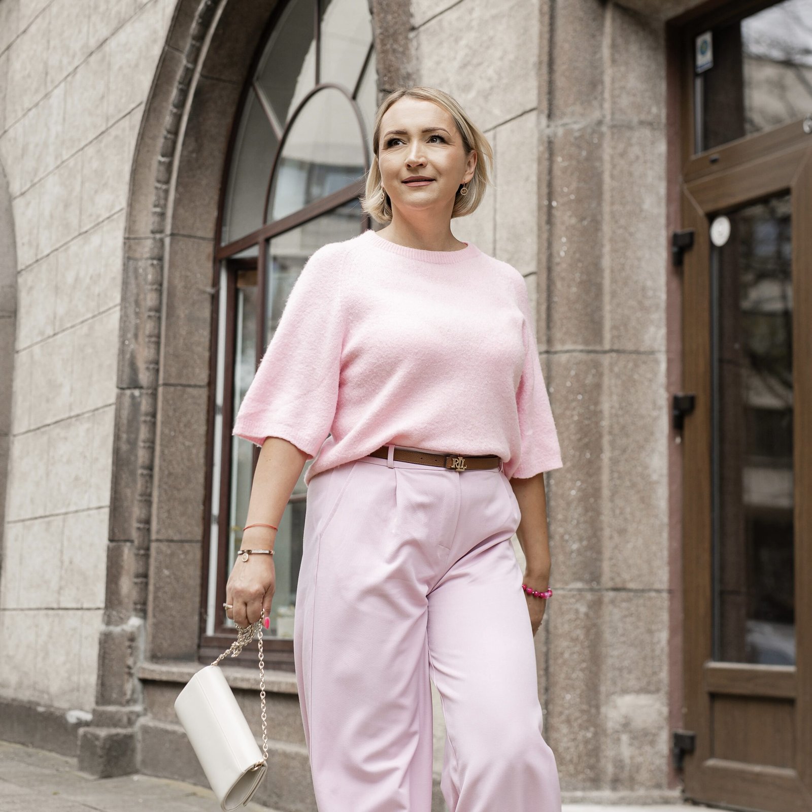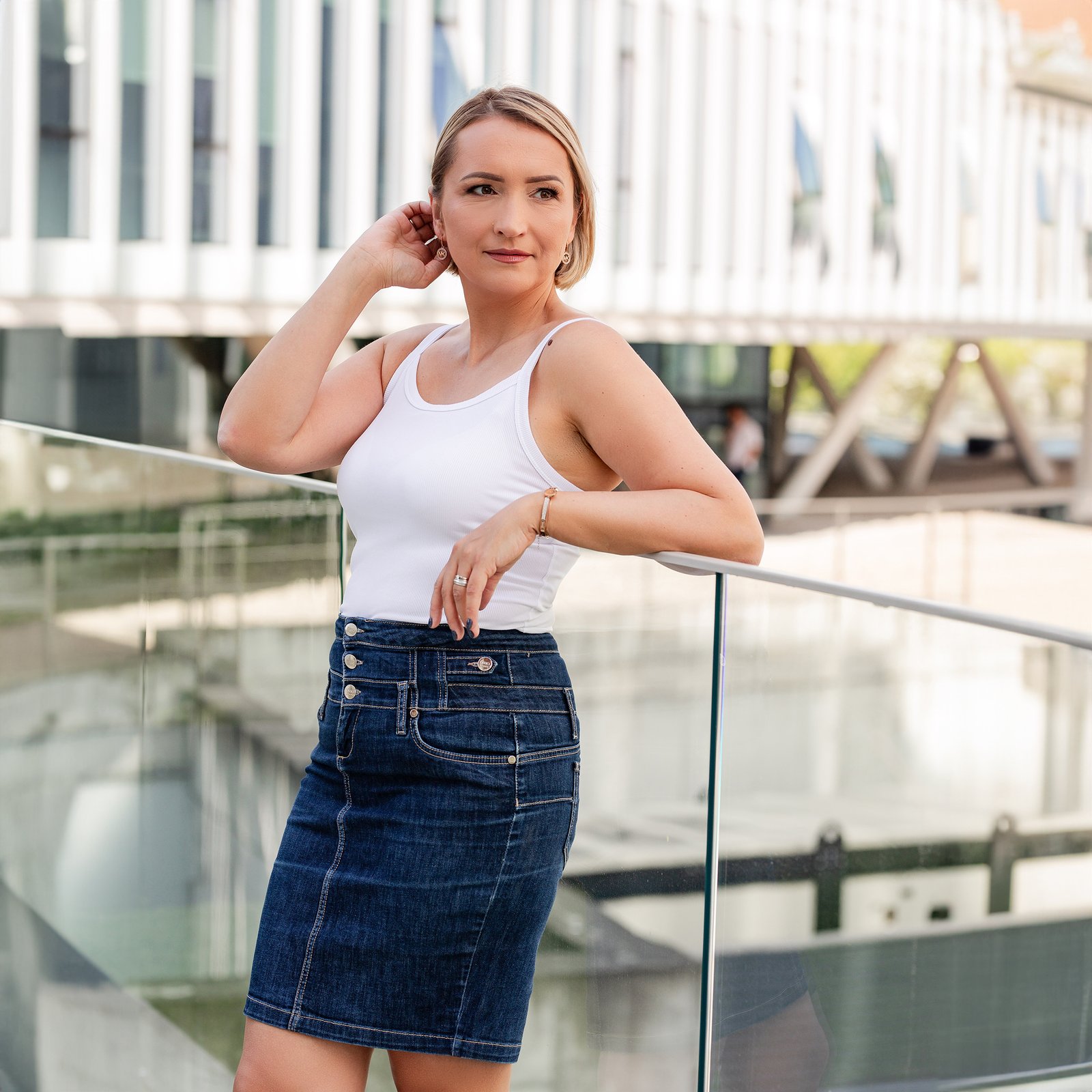 Moteris su mėlyna suknele, žiūrinti į tolį