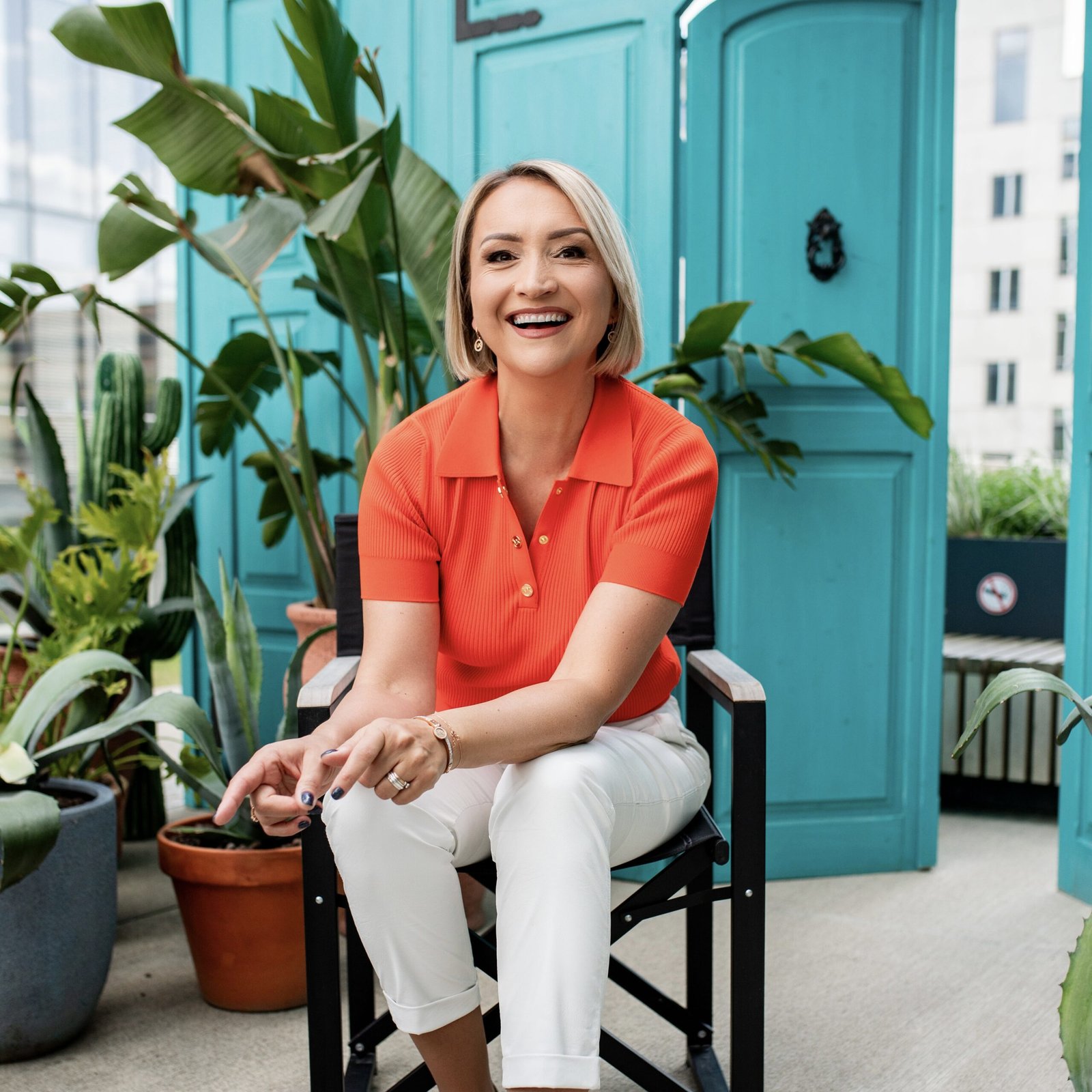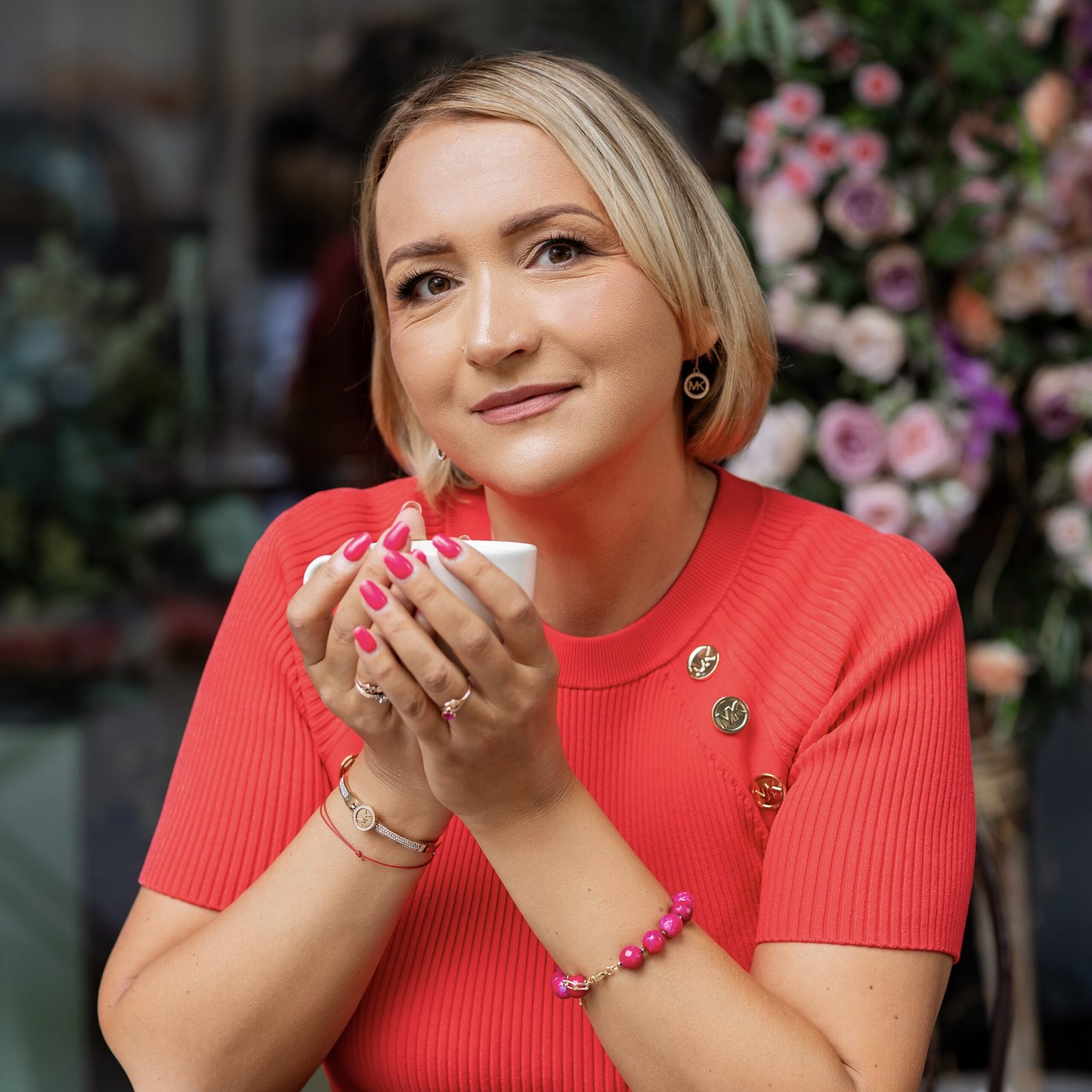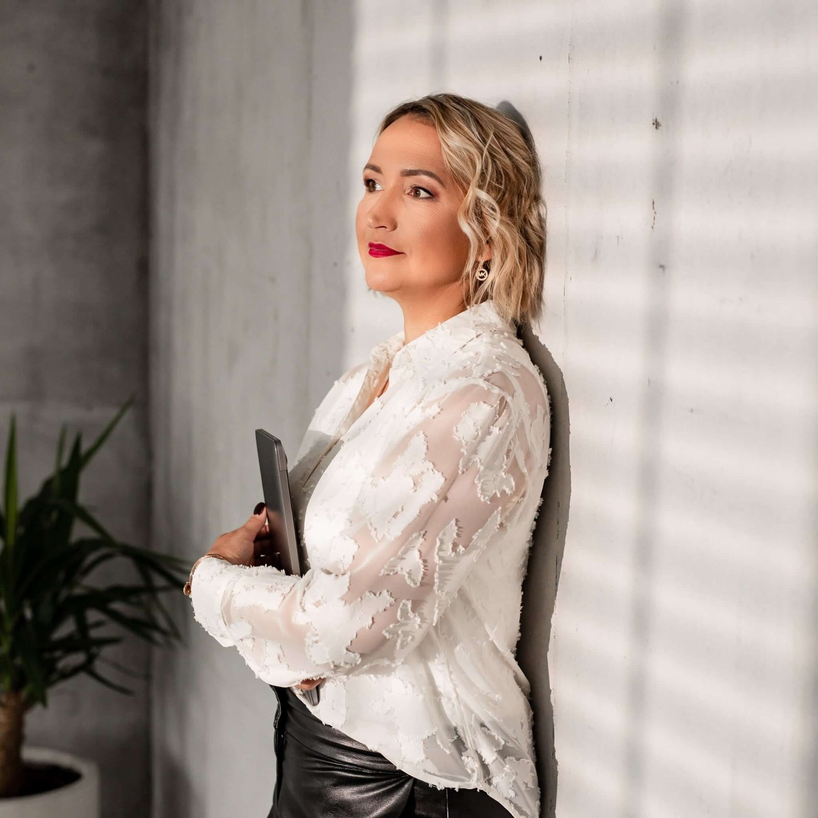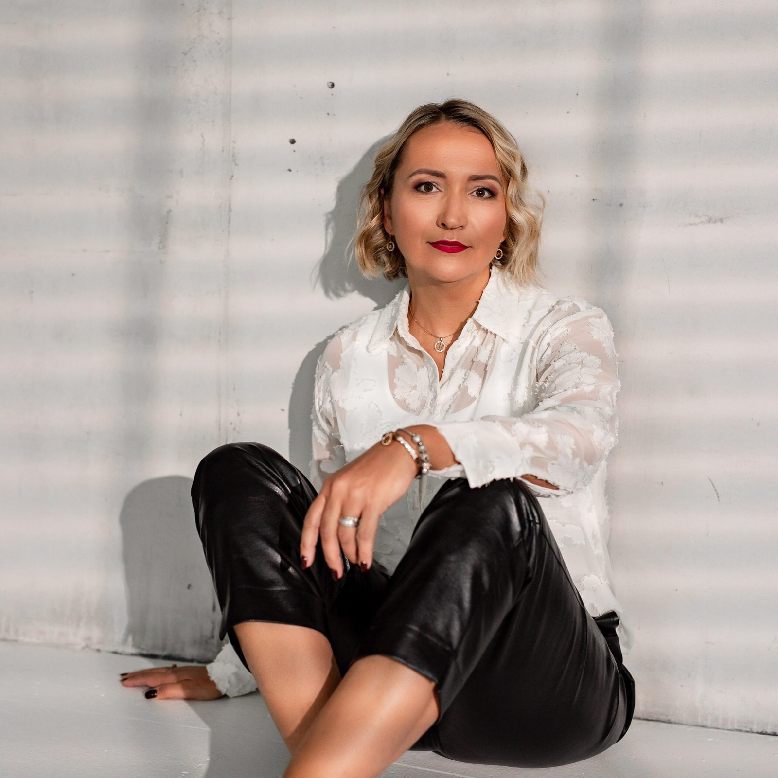 sėkminga sėdinti moteris su raudonu kostiumėliu
